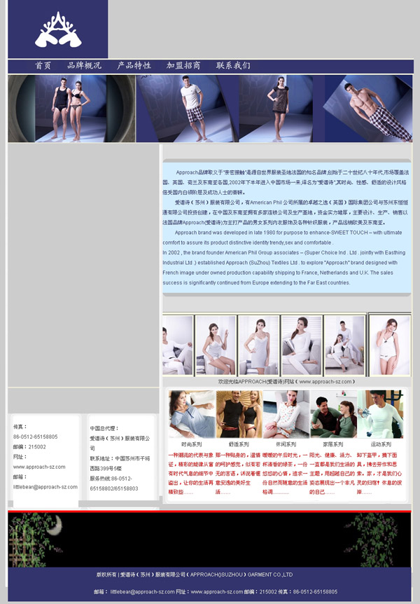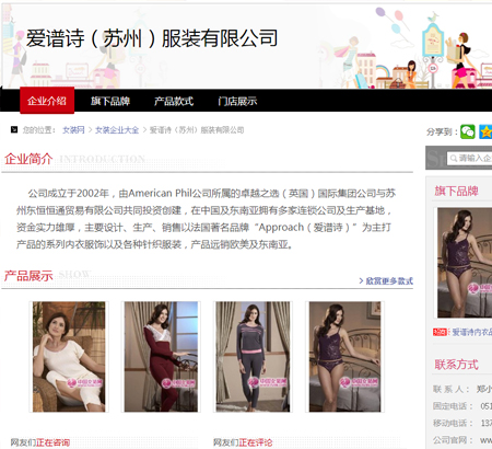 愛譜詩(蘇州)妝扮有限公司,有American Phil 公司所屬的良好之選(英國)國際團(tuán)體公司與蘇州東恒恒通有限公司投資創(chuàng)建,在中國及東南亞擁有多家連鎖公司及生產(chǎn)基地,資金力氣雄厚,緊急操持、生產(chǎn)、販賣以法國品牌Approach(愛譜詩)為主打產(chǎn)物的男女系列褻服衣飾及種種針織妝扮,產(chǎn)物遠(yuǎn)銷西歐及東南亞。