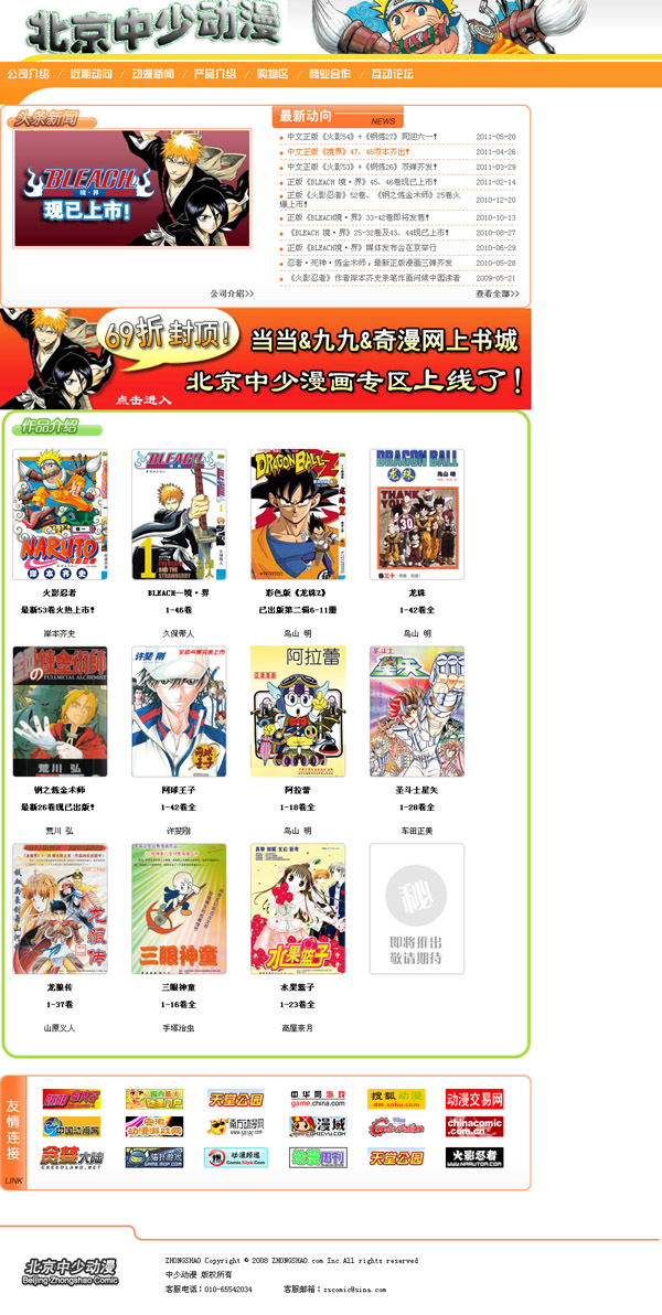 公司自創建以來,積極與國表里各大出書社相助。如今正在運營的書刊有數百種,此中《火影》(首印10萬套,上市月余即加印)、《龍珠》(上市三年銷量近千萬冊)、《鋼之煉金術師》、《網球王子》、《圣斗士》(已經再版多次)、《水果籃子》、《阿拉蕾》、《三眼神童》、《龍狼傳》以及海內最高程度的原創作品“四臺甫著”等多部漫繪圖書深受讀者接待,市場回聲極其火爆。