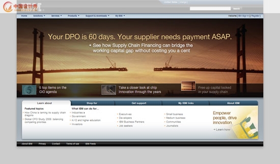 另外我們還可以看到IBM這次新的設計比原來的設計更有立體感,這就是我上面所說的元素層次。這種層次感拉開了瀏覽者的視覺深度,使得我們的網頁不再平面。雖然也不是3D的效果,但是我相信2D的效果必然會成為網頁設計的一個新的趨勢。通過2D模擬出視覺立體感,會使得網頁設計更有張力,內容也更為豐富。