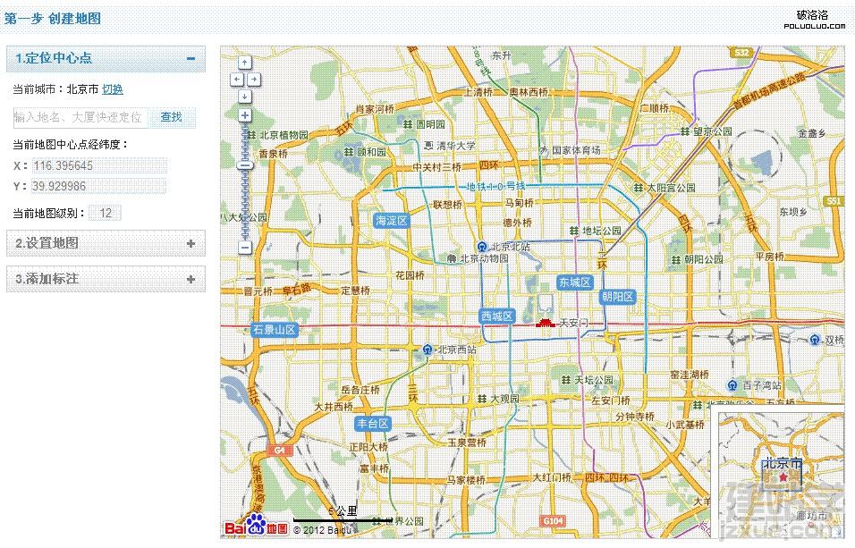1.定位中心點,默認為北京,點擊切換,輸入公司的具體所在城市和具體地址。這個時候,地圖會切換到該地點范圍內。