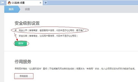 2、點(diǎn)擊“設(shè)置”按鈕,選擇安全級(jí)別為“完全公開”,保存。此時(shí)QQ客戶就會(huì)恢復(fù)在線狀態(tài),可以接收來自網(wǎng)頁上的臨時(shí)會(huì)話。請(qǐng)留意下面“停用服務(wù)”按鈕,如果點(diǎn)擊此按鈕,將會(huì)停止所有的網(wǎng)頁QQ在線服務(wù),因而如果要停用某個(gè)網(wǎng)頁的QQ在線服務(wù),可以點(diǎn)擊此按鈕。