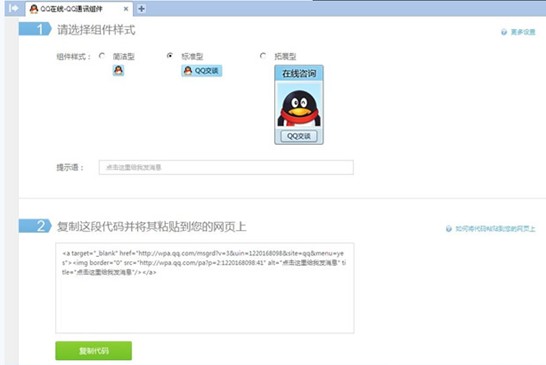 3、點(diǎn)擊網(wǎng)站右上方的“QQ通訊組件”按鈕,可以根據(jù)自己的喜好選擇相應(yīng)的QQ在線客戶顯示形式。此步驟需要將代碼復(fù)制黏貼到你的網(wǎng)站代碼中方可啟用。途徑:原網(wǎng)站QQ在線客服代碼==》重新設(shè)置后的QQ在線客戶代碼==》保存生成即可。不熟悉網(wǎng)站代碼的可以請(qǐng)網(wǎng)站建設(shè)公司幫忙設(shè)置。