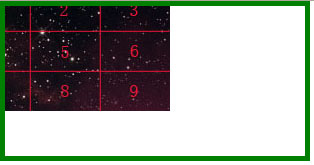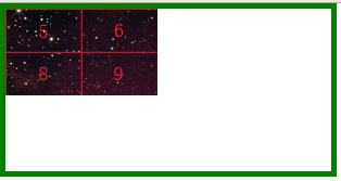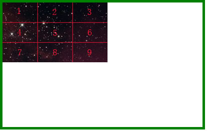 注: 本文中使用的圖片大小為 300px*120px,為了能很清晰的表達圖形的哪部分被隱藏了,按照圖片的大小平均分成了9等份。同時背景圖片容器區域繪制出綠色邊框清晰顯示容器的范圍。