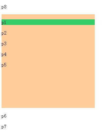 <style> #myDiv > p:first-child{ background-color:#3C6; } </style> <body> <p>p8</p> <div id=’myDiv’ style=’width:300px;height:300px;overflow:auto’> <p>p1</p> <p>p2</p> <p>p3</p> <div> <p>p4</p> <p>p5</p> </div> </div> <p>p6</p> <p>p7</p> </body>